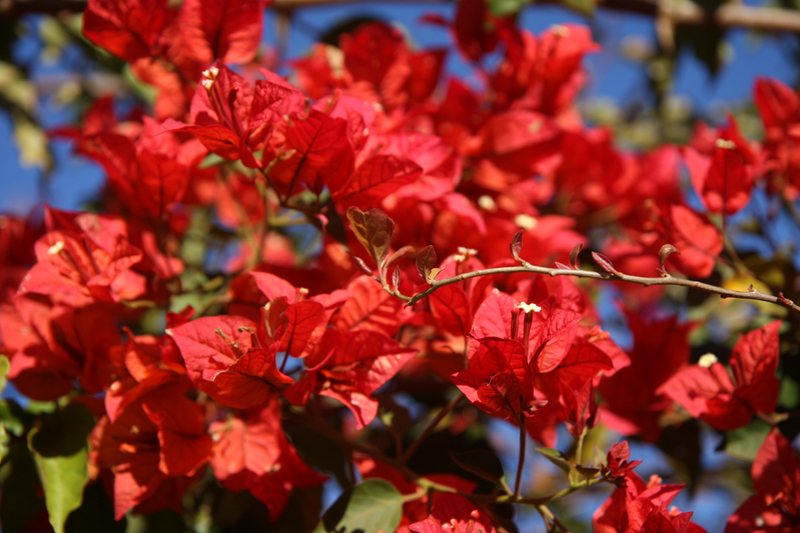 De talloze kleurrijke Bourgainvilleastruiken, rond de parkeerplaats ven het vliegveld,